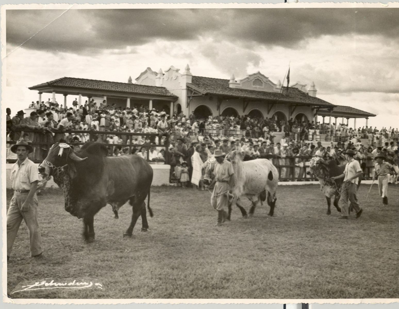 Desfile das raças zebuínas no Recinto de Avaliações da ExpoZebu, na década de 1950, fotografado por João Shroden Júnior