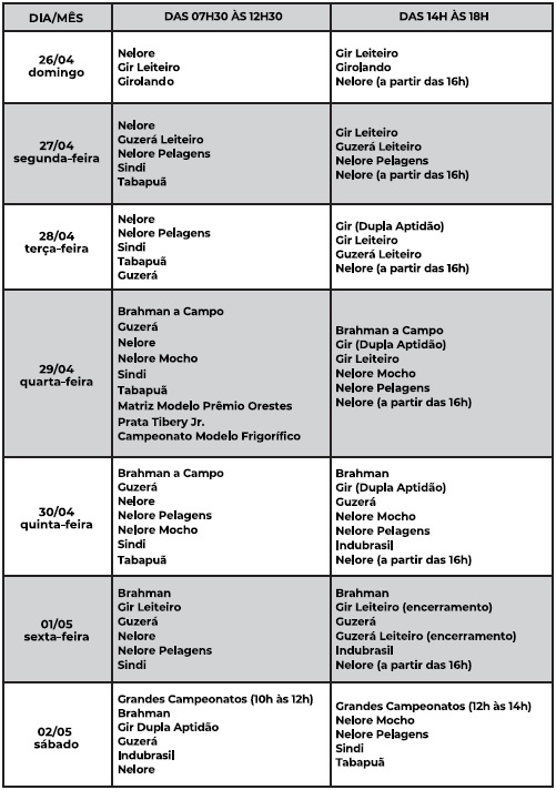 Confira abaixo o cronograma completo dos julgamentos da 91ª ExpoZebu: