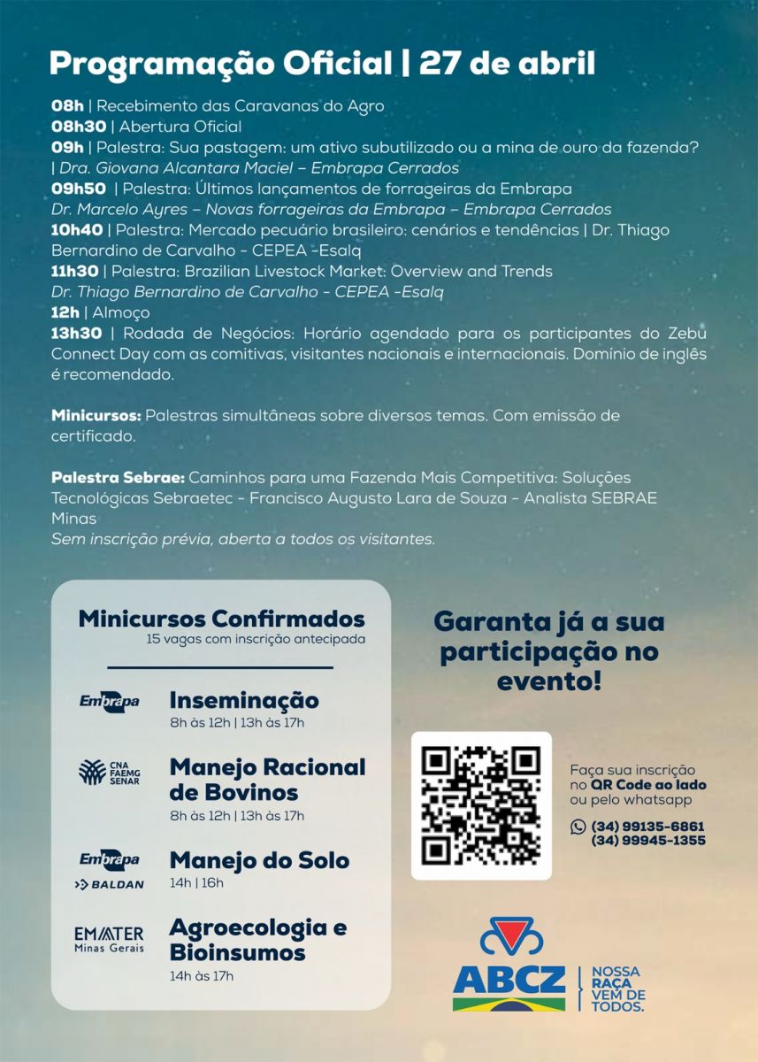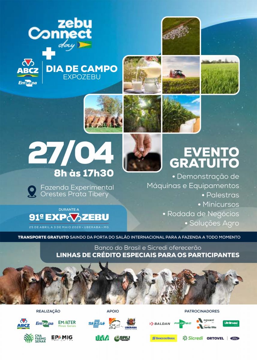 A Associação Brasileira dos Criadores de Zebu (ABCZ) promove, no dia 27 de abril, a partir das 8h, o Zebu Connect Day, dentro da programação da 91ª ExpoZebu. O evento será realizado na Fazenda Experimental Orestes Prata Tibery Júnior, em Uberaba (MG), reunindo produtores, técnicos, pesquisadores e empresas em uma agenda voltada à inovação, ao conhecimento e à prestação de serviços no campo.